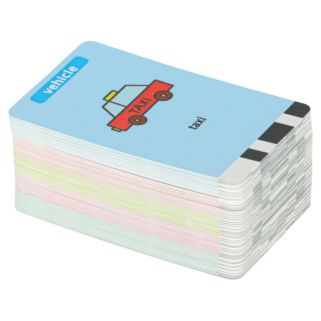 Un lot de 100 cartes avec illustrations et noms anglais favorise l’acquisition naturelle du vocabulaire via une interaction ludique.