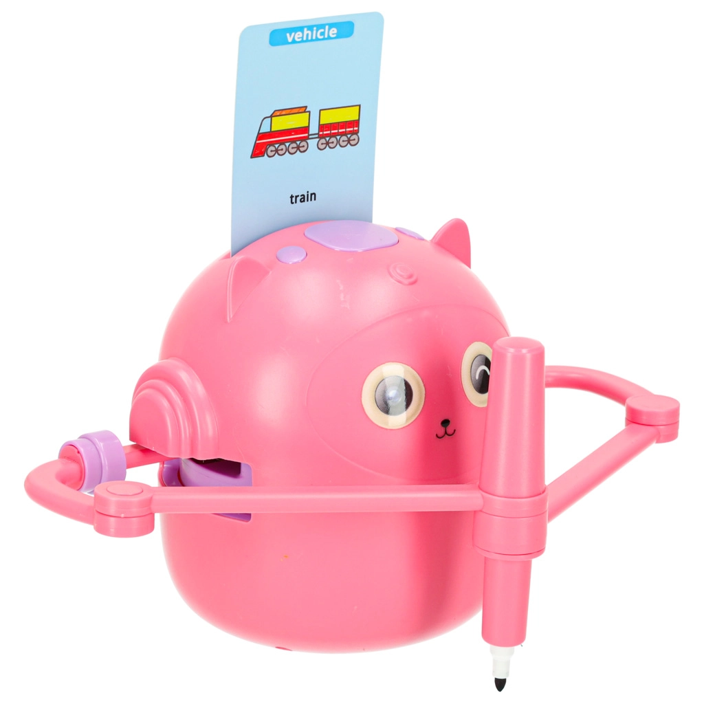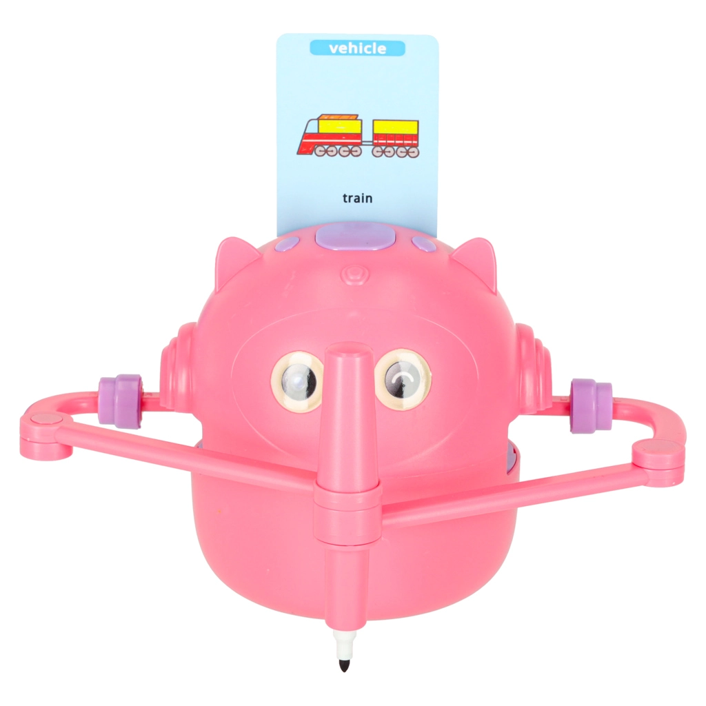 Nous misons sur la simplicité et le plaisir d’apprendre. Il suffit d’insérer une carte illustrée, de fixer le feutre dans la main du robot et d’observer l’image se créer étape par étape. L’enfant peut ensuite colorier l’illustration et entraîner sa motricité fine, sa patience et sa concentration. Des consignes vocales interactives en anglais enrichissent naturellement le vocabulaire.