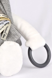 Le corps de l’ourson est confectionné dans une matière moelleuse agréable au toucher et décoré d’une fine broderie de la marque Doudou. Pour stimuler les sens et la motricité fine, l’ourson propose de nombreuses activités, comme du papier bruissant dans les pattes, un anneau de préhension en plastique et un grelot à l’intérieur du corps.
