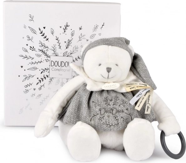 Doudou ours polaire en peluche est un jouet parfait pour les nouveau-nés. Grâce à son bonnet gris orné de rubans satinés avec de tendres messages en français, l’ourson apporte une touche de douceur à chaque câlin.