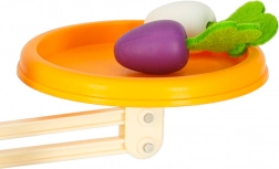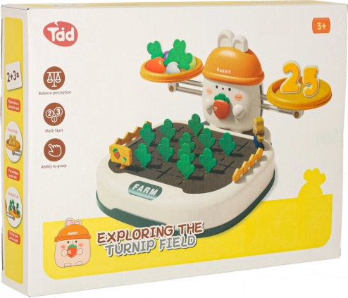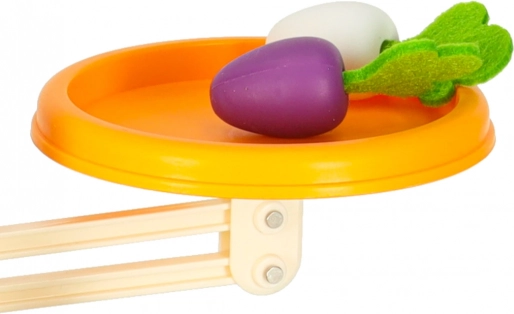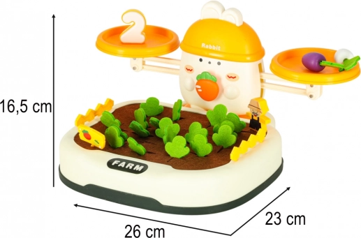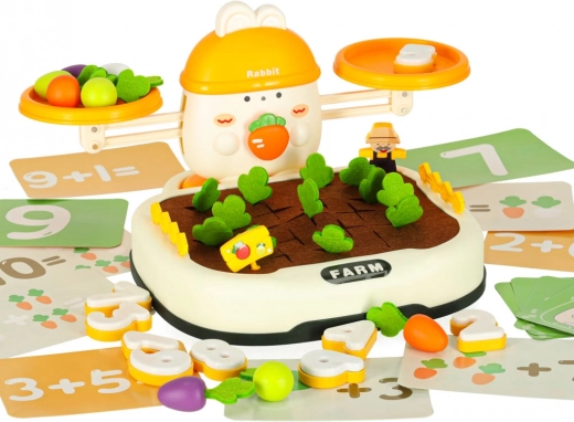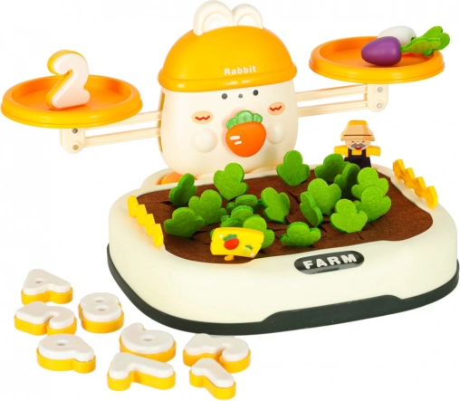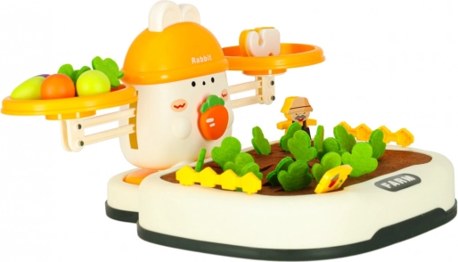 La partie supérieure de l’ensemble est contrôlée par un adorable lapin – il veille à l’équilibre. Les enfants peuvent empiler des carottes et d’autres objets pour maintenir l’équilibre ou le perturber volontairement et ainsi apprendre les bases de la physique. Il comprend également des chiffres spéciaux avec des poids correspondants, ce qui enseigne la comparaison des masses et l’introduction des valeurs numériques.