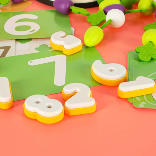 Une planche spécialement conçue avec des trous permet aux enfants d’exercer la précision de leurs mouvements – poser et retirer les carottes aide à développer les compétences motrices et introduit un élément de saine compétition avec le jeu « qui récoltera le plus vite ».