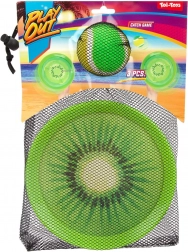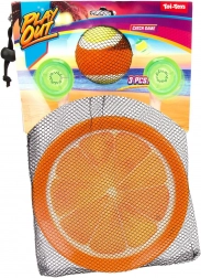 Le kit dans un sac filet est idéal pour les voyages. Le motif orange et les palettes en plastique légères assurent une prise facile et une action rapide partout.