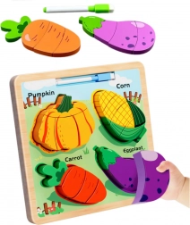 Ce puzzle en bois offre aux enfants une excellente occasion d’apprendre les formes et d’exercer leur motricité fine. Il comprend quatre légumes populaires : citrouille, maïs, carotte et aubergine. Chaque élément est divisé en petites parties que les enfants assemblent dans les zones correspondantes du plateau.
