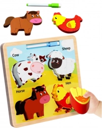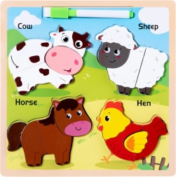 Ce puzzle éducatif en bois présente des animaux tels que la vache, le mouton, le cheval et la poule, bien connus des enfants. Chaque animal est composé de plusieurs pièces à placer au bon endroit, ce qui favorise le développement de la coordination motrice et de la pensée logique.