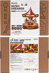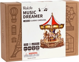 Créez un morceau de nostalgie avec ce puzzle 3D en bois de manège. Assemblez votre propre boîte à musique avec éclairage LED et 4 mélodies classiques sans utiliser de colle. Le manège sera un complément unique à l'intérieur ou un cadeau original.