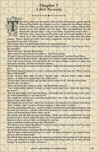 Puzzle recto-verso avec une scène emblématique et un extrait du livre Alice au pays des merveilles. Parfait pour les amateurs de puzzles et de classiques de la littérature.