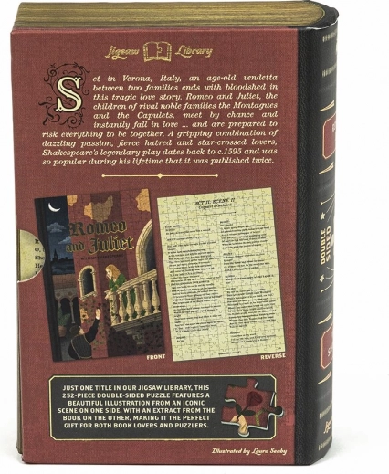 Profitez de l’assemblage de ce fascinant puzzle recto verso, qui propose d’un côté une illustration saisissante d’une scène célèbre de Roméo et Juliette et de l’autre un extrait littéraire envoûtant. Ce puzzle est idéal pour les amoureux de la littérature comme des puzzles.