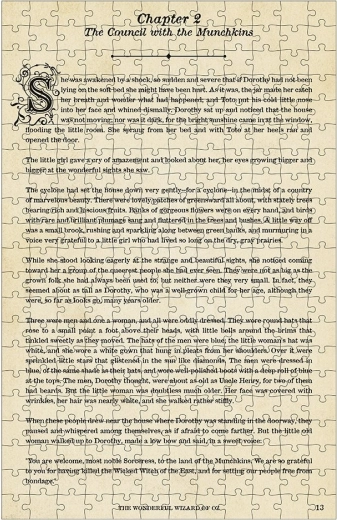 Plongez dans la magie du monde du Magicien d’Oz avec ce puzzle réversible unique. D’un côté, une superbe illustration d’une scène emblématique, de l’autre, un extrait captivant du livre.