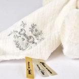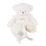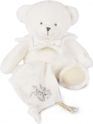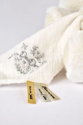 L’ourson est doté d’une couverture qui se range facilement dans son petit ventre, ce qui est très pratique pour voyager ou pour le rangement. Le Doudou est orné d’une délicate broderie et de rubans satinés avec inscriptions françaises, ajoutant une touche de douceur à chaque câlin.