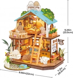 Découvrez la magie de la création avec une maisonnette comprenant une chambre spacieuse, un séjour chaleureux avec balançoire et coin repas, ainsi qu’un balcon au premier étage. Chaque détail est finement découpé et inclut un linge de lit moelleux, une table de nuit avec lampe, un ordinateur portable, une bibliothèque, un distributeur de cappuccino et des fleurs. Grâce à l’éclairage LED au rez-de-chaussée et au premier étage, votre compagnon se sentira à l’aise.