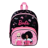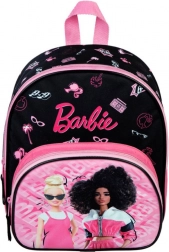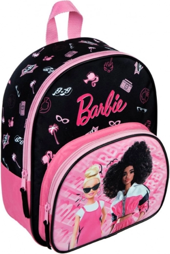 Le sac à dos au motif Barbie offre un look attrayant dans une combinaison rose et noir avec des illustrations de la poupée préférée.