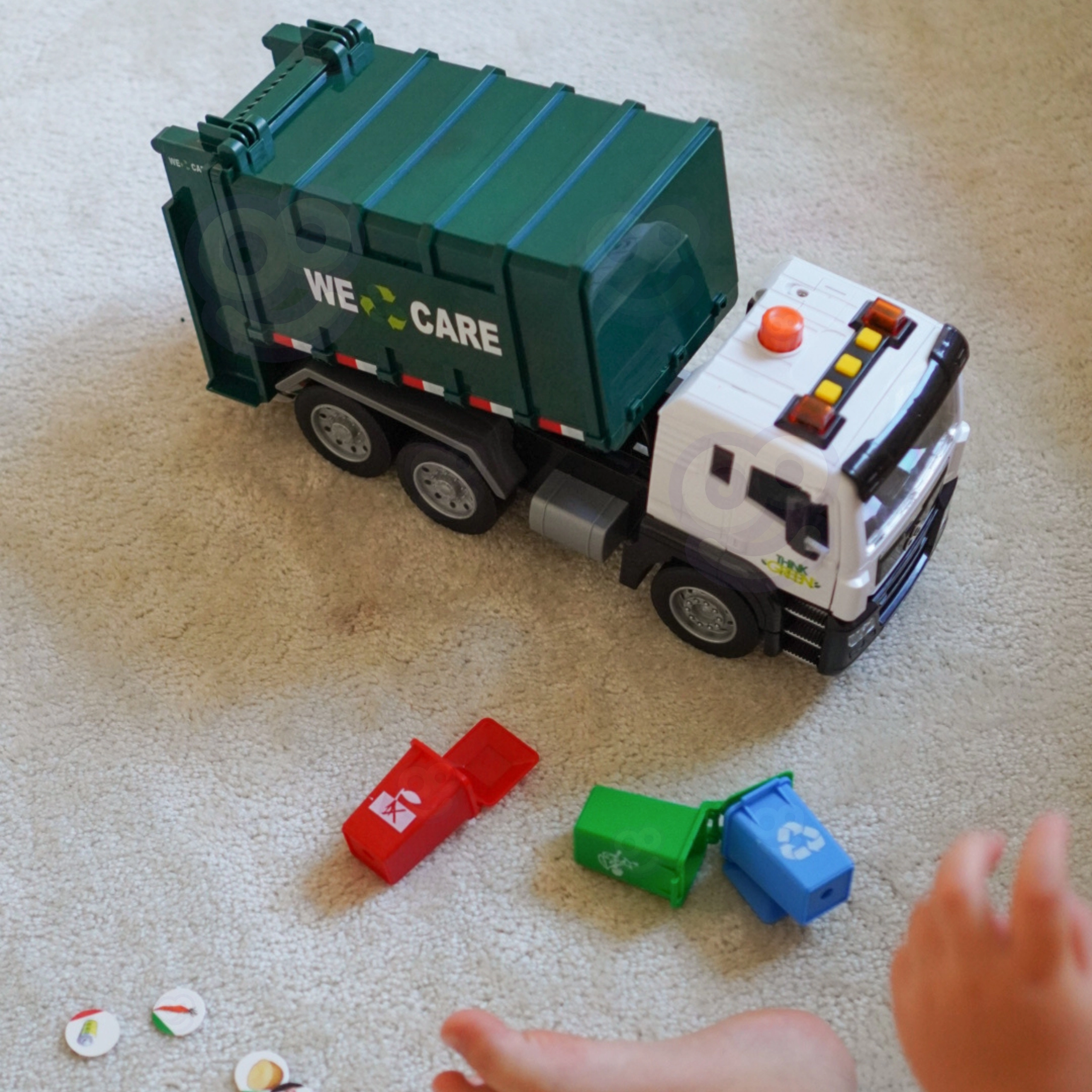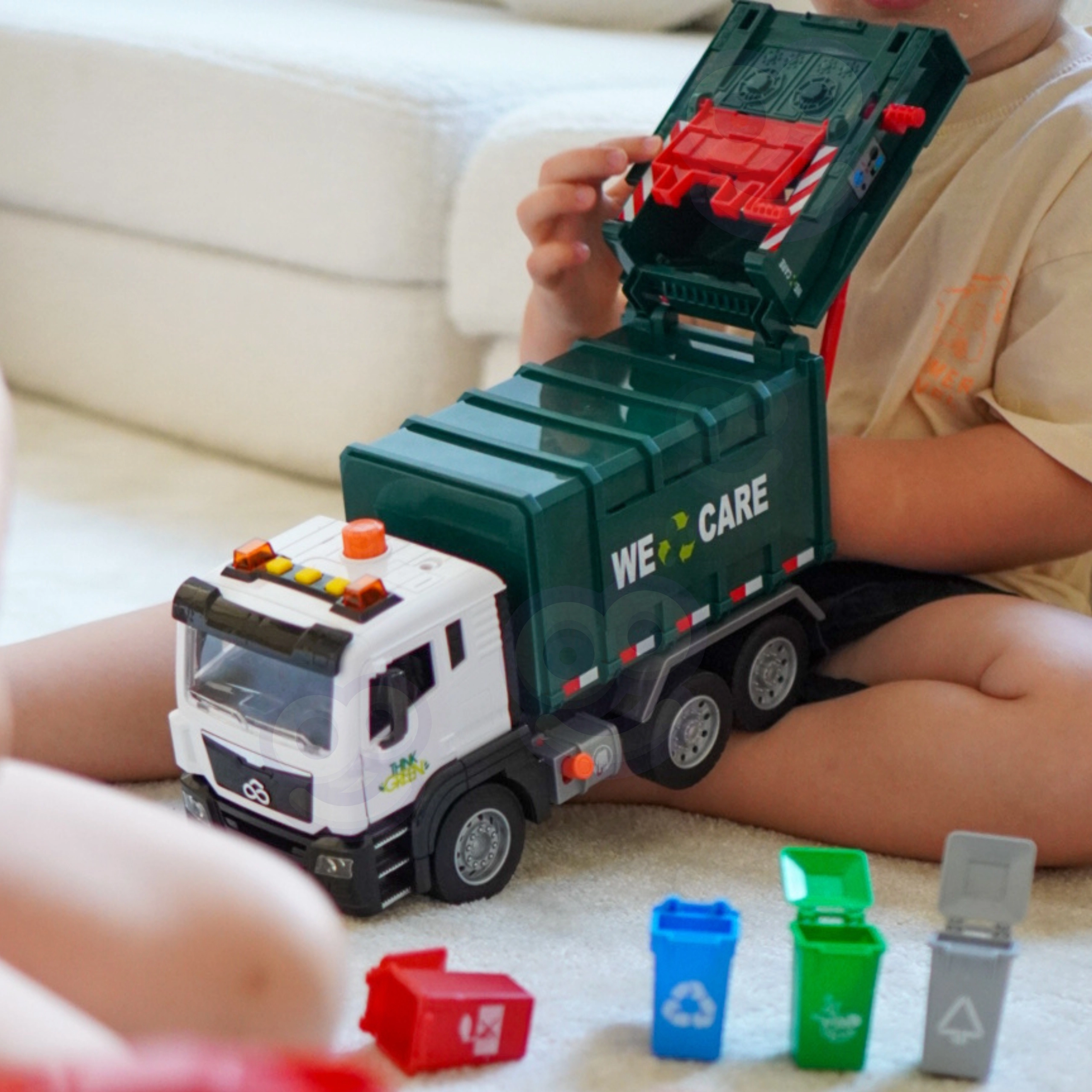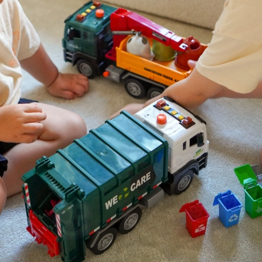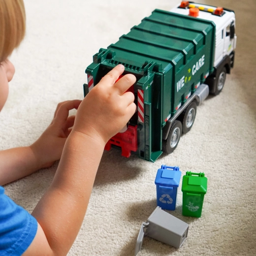 Le camion-benne interactif à l’échelle 1:10 séduit par sa finition réaliste, ses effets lumineux et sonores, son levage fonctionnel des poubelles et sa trappe arrière ouvrante. Il comprend 4 poubelles de couleur et des cartes illustrées pour jouer et apprendre le tri des déchets, ce qui développe la créativité, l’imagination et la logique des enfants dès 3 ans.