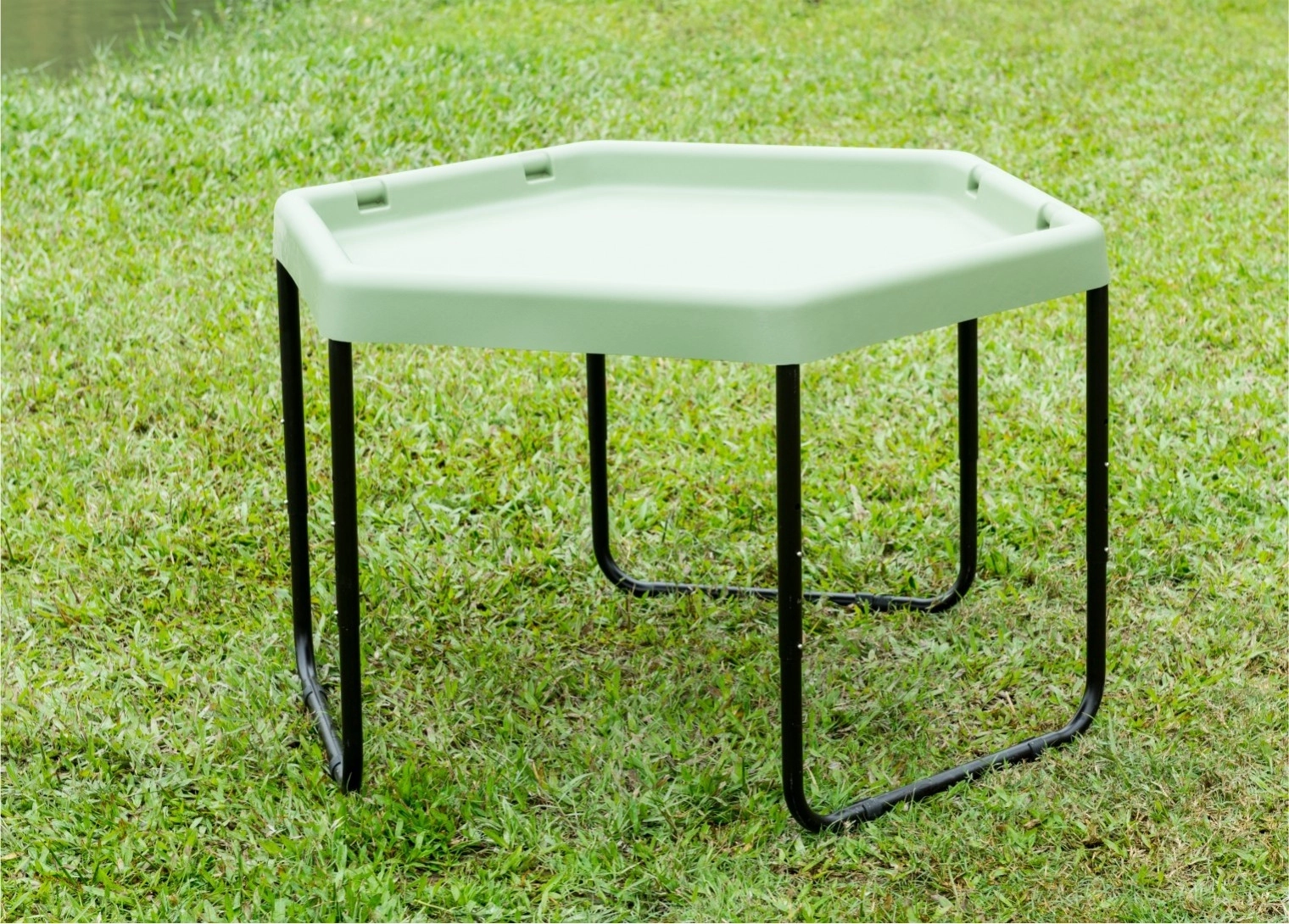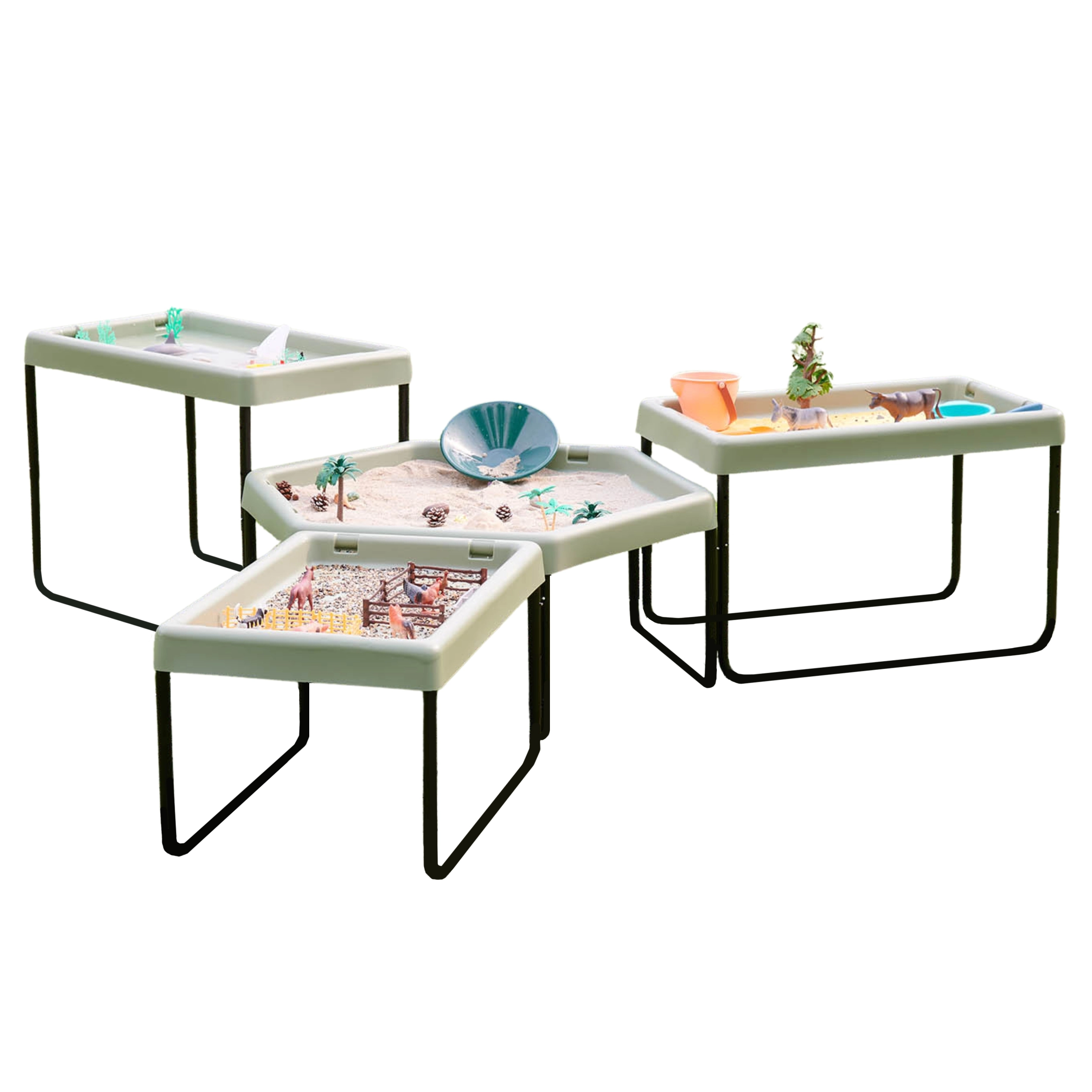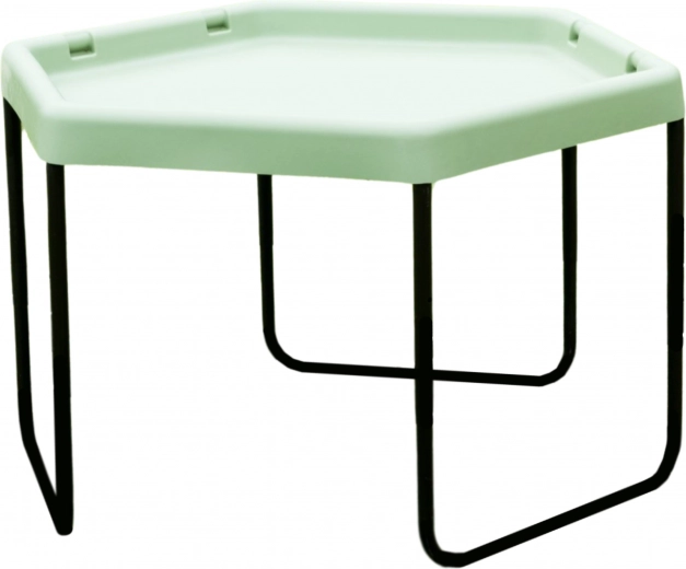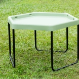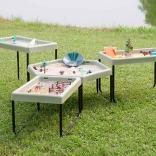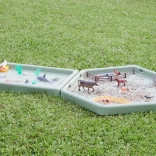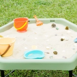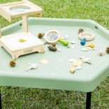 La table hexagonale permet aux enfants de développer leur créativité en jouant avec le sable, l’eau ou de petits mondes thématiques.