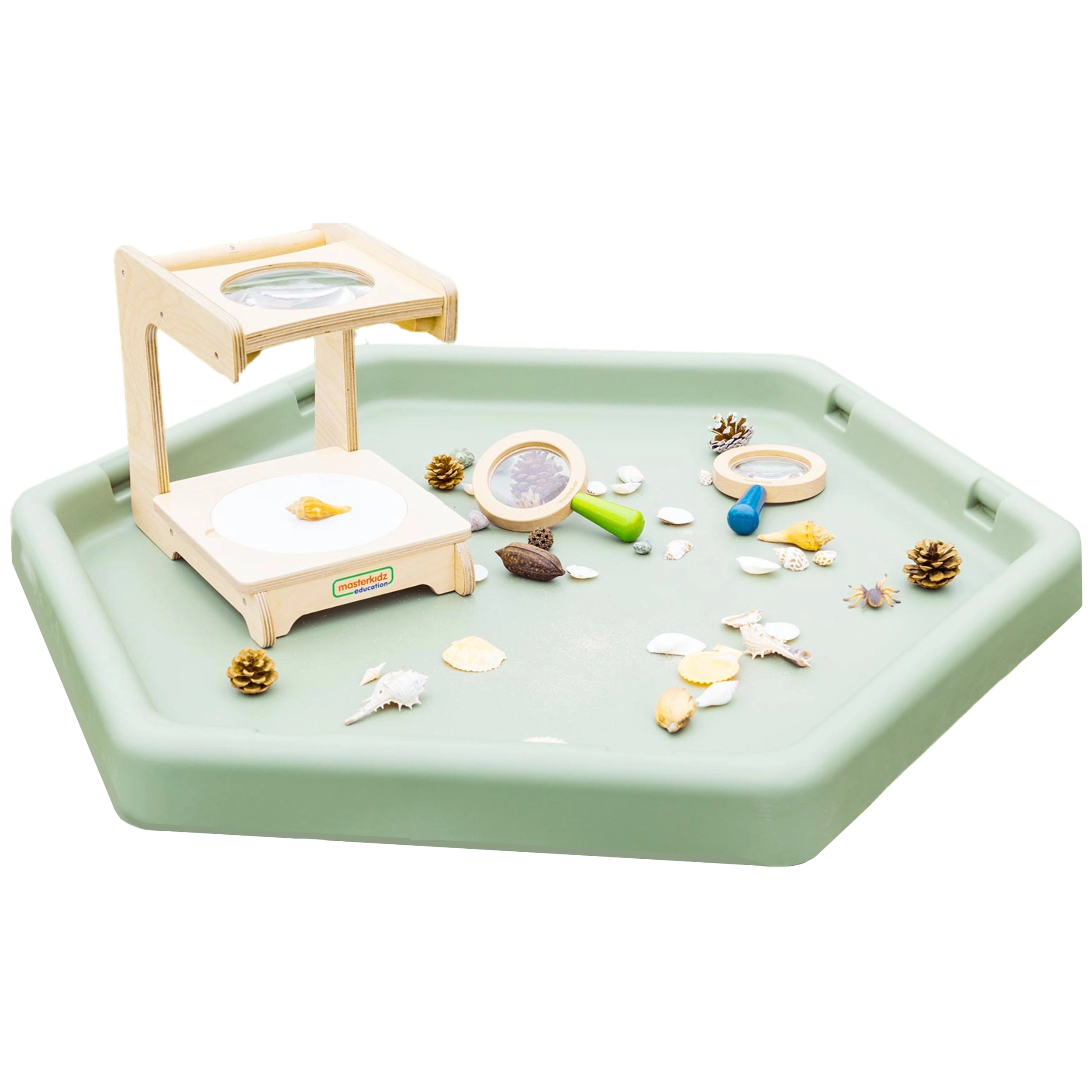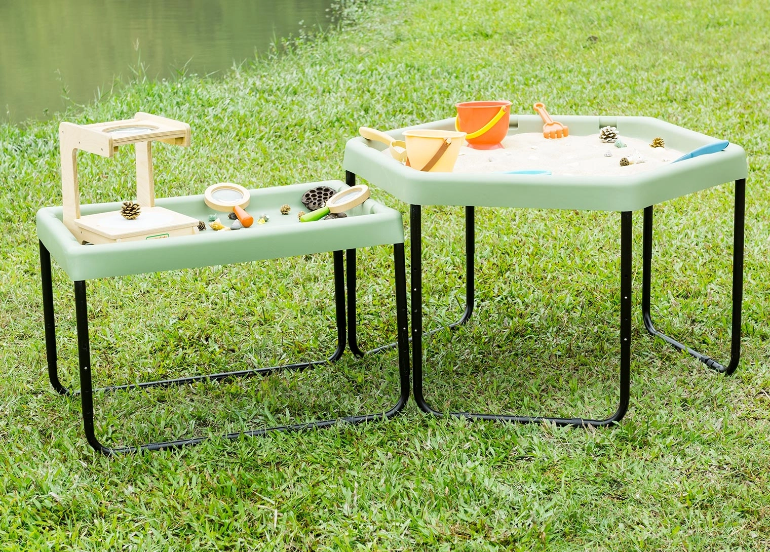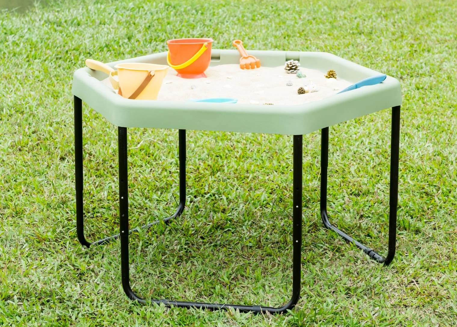 La table hexagonale permet aux enfants de développer leur créativité en jouant avec le sable, l’eau ou de petits mondes thématiques.