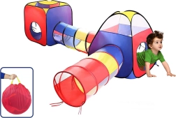 Cet ensemble comprend deux tentes cubiques et des tunnels aux couleurs vives — rouge, bleu et jaune — qui créent un environnement joyeux et stimulant.
