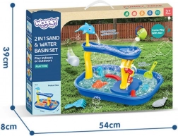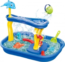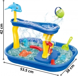 Jouet aquatique 2 en 1 avec roue à eau et toboggan - idéal pour l'été ! Créez une zone ludique unique pour les enfants dans le jardin ou à la maison. La table ludique et colorée combine le plaisir de la pêche, de l'écoulement de l'eau et de l'observation de son flux à travers des structures amusantes comme la roue à eau ou le toboggan avec dauphin.