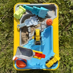 Le grand set de table sur le thème du chantier offre des heures de jeu sensoriel et créatif. La double cuve permet de remplir séparément une partie d’eau et l’autre de sable, afin que les petits constructeurs puissent essayer de creuser, verser, transvaser et conduire des véhicules. Grâce aux pieds « cônes » stables, la table est solide et sûre pour une utilisation en extérieur comme en intérieur.