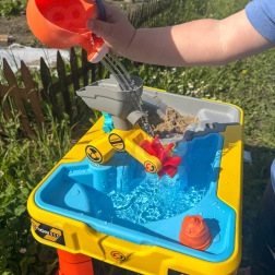 La double cuve permet de jouer simultanément avec l’eau et le sable – idéal pour l’exploration sensorielle et des scénarios de jeu de construction sans fin.