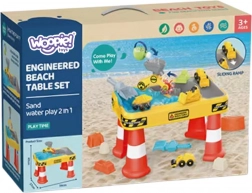Inclus : 4 mini véhicules de chantier (pelleteuse, bétonnière, benne, bulldozer), grue pivotante, descente pour véhicules, rampes et roue à eau ainsi que des accessoires pratiques pour le sable et l’eau (arrosoir, pelle, râteau, moules). La conception simple permet un montage rapide sans outils et un nettoyage facile après le jeu.