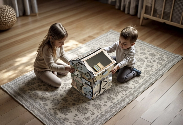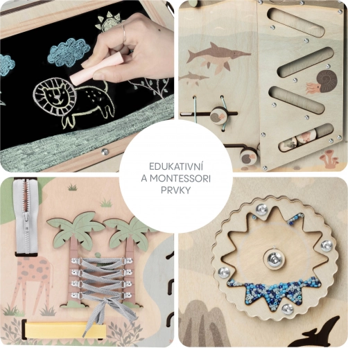 Labyrinthes, engrenages, interrupteurs, fermetures à glissière et lacets entraînent la coordination œil-main, l’agilité des doigts et la patience lors de la résolution de tâches.
