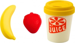 Le kit comprend également des fruits en plastique colorés : fraise, banane et citron vert, ainsi qu'une tasse pour cocktail. Tous les éléments sont sécurisés et s'adaptent parfaitement aux petites mains des enfants.