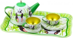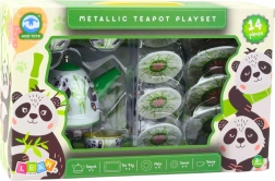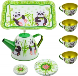 Le service à thé en métal pour enfants avec motif panda est idéal pour les petits amateurs de goûters à base de thé. L'emballage comprend une théière, quatre tasses, des sous-tasses et des assiettes. Chaque élément est décoré de joyeuses images de panda et de bambou aux couleurs vertes et blanches, offrant aux enfants une expérience de jeu amusante et colorée.