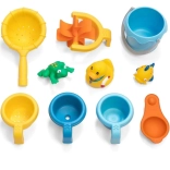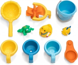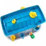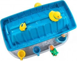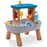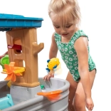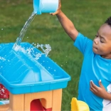 La table d’eau pour enfants de la marque Step2 propose un jeu polyvalent. Le double réservoir crée un effet de pluie réaliste – il suffit de verser de l’eau et le jeu peut commencer ! L’eau du réservoir supérieur déclenche un véritable effet de pluie. D’un côté, l’eau tombe dans un seau qui se renverse une fois plein et se vide, tandis que de l’autre côté l’eau s’écoule par un canal vers une hélice tournante. L’ensemble comprend également un tremplin pour petits animaux, un support pour le seau et une passoire. Le tout s’écoule vers une petite piscine au fond.