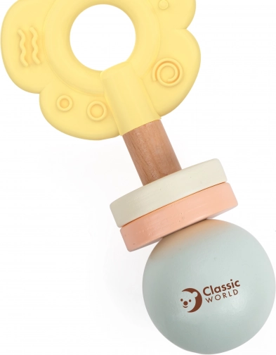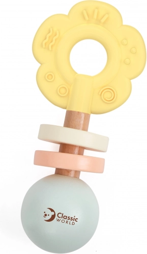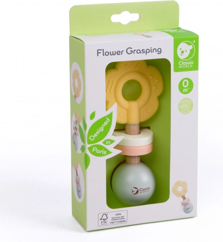 Adorable hochet en forme de fleur, conçu pour les tout-petits, avec de douces couleurs pastel qui attirent l’attention de l’enfant. Fabriqué à partir de matériaux sûrs, bois et silicone, adapté dès la naissance.