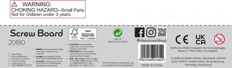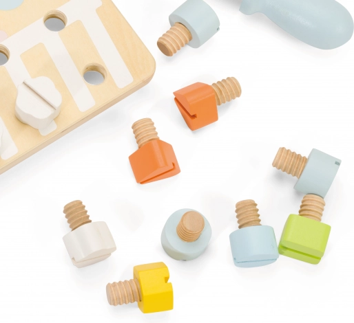 Planche en bois avec vis colorées de Classic World conçue pour développer les enfants par le jeu. Les enfants peuvent créer différentes formes à l’aide des vis, ce qui contribue au développement de leur coordination et de leur motricité.