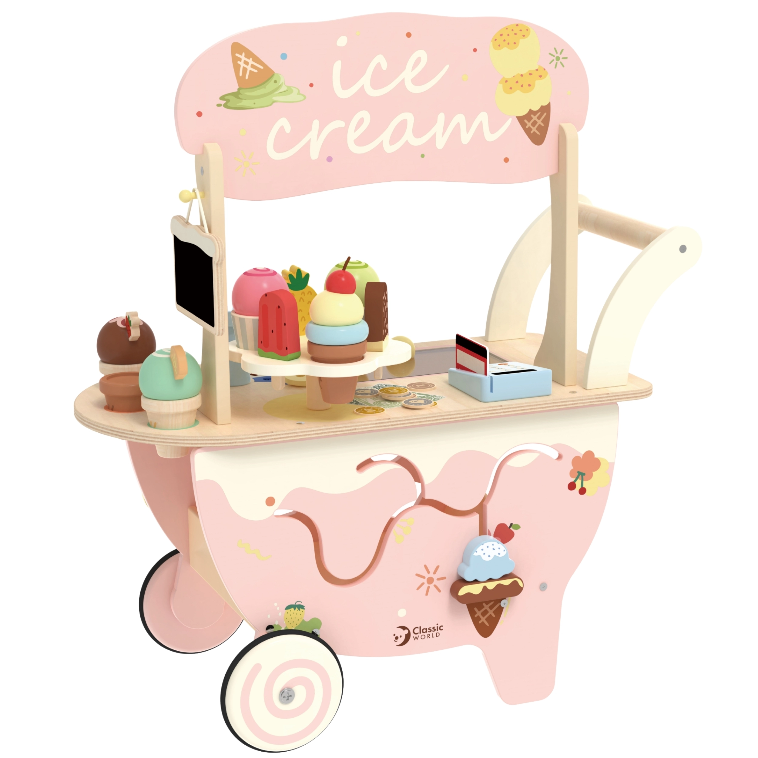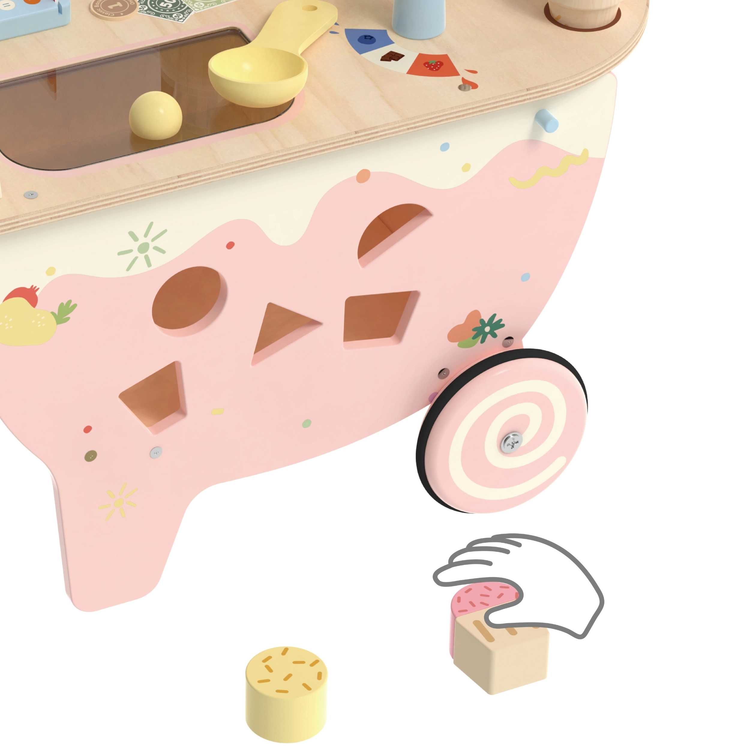 Nous vous présentons la glacier en bois 3-en-1 de Classic World, idéale pour les enfants dès 3 ans. Ce jouet multifonction ne sert pas seulement de glacerie, mais aussi de jeu de tri, de labyrinthe et de tableau pour dessiner. Il est fabriqué avec des matériaux durables et sûrs, aux couleurs pastel et motifs décoratifs qui séduiront chaque petit commerçant. Grâce au riche assortiment d’accessoires glacés, incluant différentes saveurs, toppings et cornets, les enfants peuvent pleinement s’immerger dans le jeu de magasin ou de glacerie.