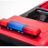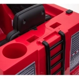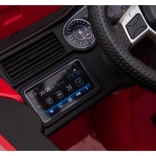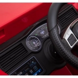 À l’intérieur du véhicule se trouvent un volant rotatif avec bouton de démarrage et un tableau de bord avec des imitations d’instruments de mesure. Les paramètres techniques incluent une batterie 12V7 Ah et deux moteurs de 2x45W, permettant une vitesse de 2 à 4 km/h. Les roues en gomme EVA assurent une conduite confortable sur différentes surfaces.