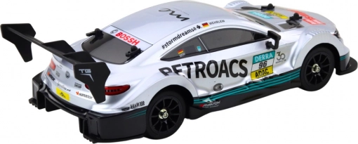 Voiture RC 1:16 argent avec moteur puissant, éclairage LED et vitesse de 30 km/h pour un drift amusant.