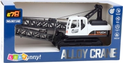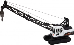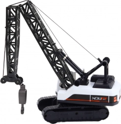 La grue possède un bras mobile avec un crochet qui peut être levé et abaissé. Le bras de la grue se meut sur des articulations et la base pivotante permet une rotation complète à 360°. L'ensemble est monté sur un châssis à chenilles solide, augmentant le réalisme et la stabilité. Le jouet est conçu en blanc et noir avec des détails imitant un équipement de construction professionnel.