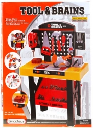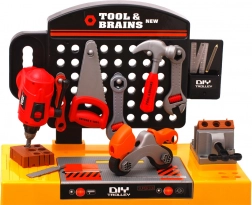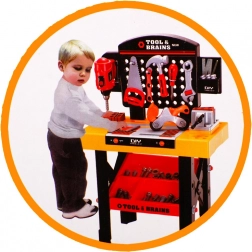 Un excellent ensemble pour les petits bricoleurs, qui les encourage à découvrir le monde de la technique. Outre le plan de travail principal, le set comprend également une étagère pour accessoires afin de ranger tous les outils. L’enfant peut travailler en toute sécurité avec un marteau, des tournevis, une clé à molette, une scie, des vis et écrous, une lime, une perceuse et d’autres outils.