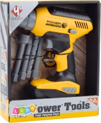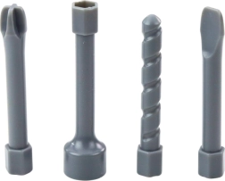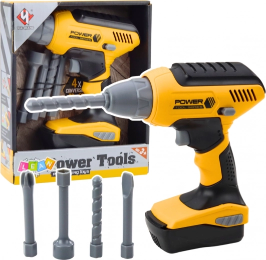 Le set comprend 4 embouts interchangeables : foret, tournevis plat, tournevis cruciforme et clé. Les enfants peuvent adapter l’outil à leurs « réparations ».