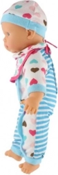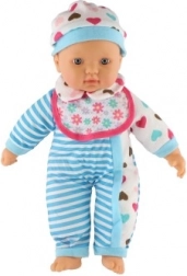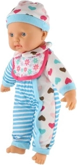 La poupée est vêtue d'une tenue rayée bleu et blanc avec d'adorables petits cœurs. Elle est équipée d'une sucette et d'un biberon, ce qui ajoute un aspect réaliste au jeu.