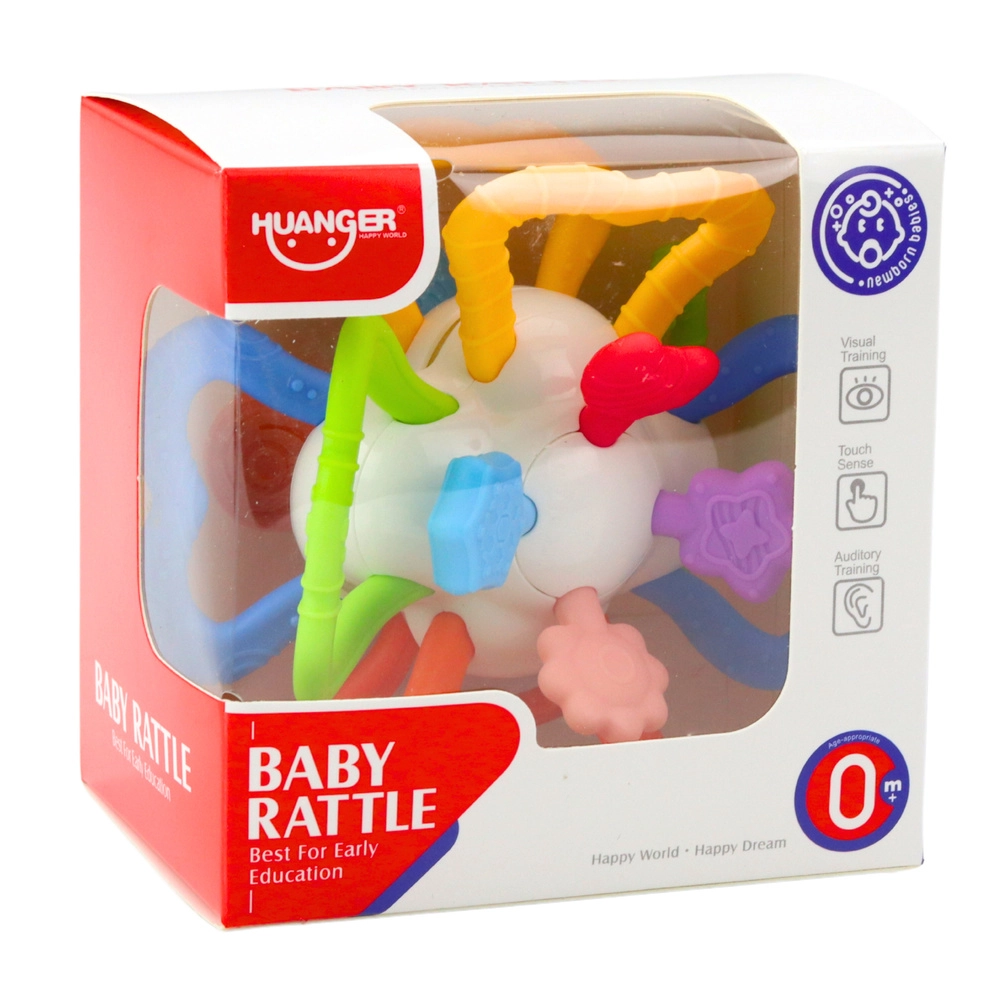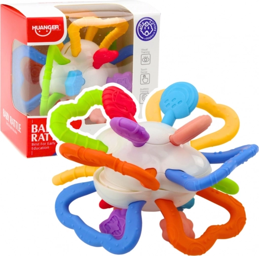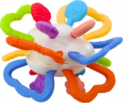 Ce jouet se compose de deux parties centrales mobiles et rotatives que l’enfant peut actionner, ce qui aide à exercer la préhension et à développer la coordination œil-main. De plus, l’ensemble du jouet est entouré de poignées colorées et flexibles de formes et textures variées, fabriquées dans un matériau sûr et souple rappelant le caoutchouc. Ces éléments sont idéaux pour mâchouiller, apportant un soulagement pendant la poussée dentaire.