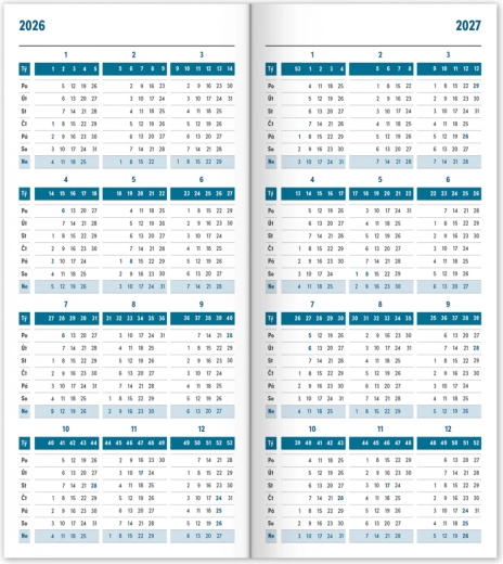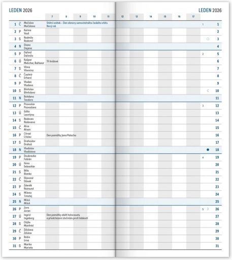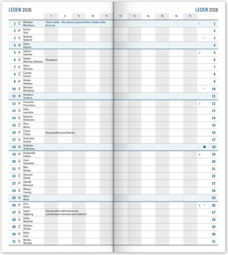 - Contient un calendrier tchèque avec prénoms, jours fériés et journées commémoratives.