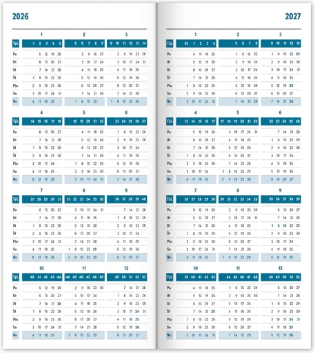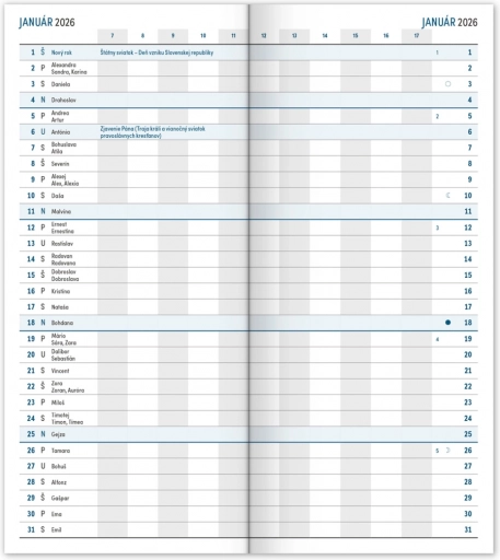 Agenda fin et pratique de couleur bleue avec une vue mensuelle, qui tient vraiment partout. Contient un calendrier slovaque, les jours fériés et les journées commémoratives.