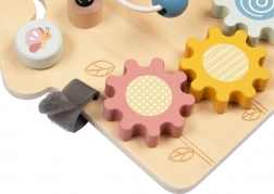 Les engrenages, les glissières, l’arc de perles arc-en-ciel, le miroir et le rouleau rotatif captent l’attention et développent la motricité fine ainsi que la coordination.