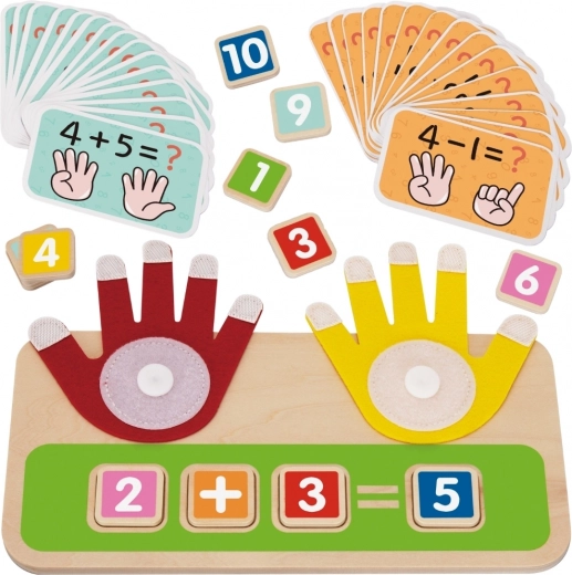 • Socle en bois avec deux mains mobiles (rouge et jaune) simulant le comptage sur les doigts