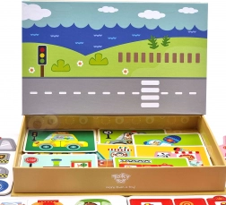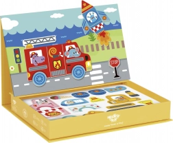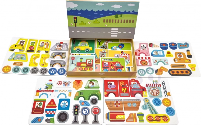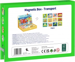 Ce puzzle magnétique dans une boîte astucieuse cache un tableau magnétique coulissant directement dans le couvercle. Les enfants peuvent utiliser les pièces magnétiques colorées pour assembler des animaux et d’autres motifs sur des cartes de fond fournies, ou créer leurs propres images. Le jeu développe la créativité, la concentration et la coordination œil–main.