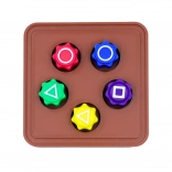 Le set comprend 5 dés colorés, fabriqués par impression 3D en plastique résistant. Chaque dé a une couleur vive différente : rouge, bleu, jaune, vert et violet, ce qui facilite le jeu et attire l’attention. Chaque dé présente des symboles caractéristiques (cercle, triangle, carré).