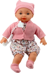 Poupée pour enfants dans un adorable ensemble comprenant un petit pull rose doux, un bonnet à oreilles et un pantalon à motifs. Les vêtements sont facilement amovibles, ce qui permet d’adapter le jeu selon vos envies. Grâce à son apparence réaliste, avec la bouche ouverte et les yeux ouverts, elle rappelle un vrai bébé, encourageant les enfants à développer sens des soins et responsabilité.