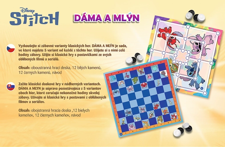 Profitez de stratégies classiques dans un habit moderne avec les motifs de Lilo et Stitch. Deux jeux populaires dans un seul coffret – Dames et Moulin – développent la pensée logique, la concentration et apportent du divertissement pour toute la famille. Plateau recto-verso pratique et tout le nécessaire dans la boîte pour jouer rapidement et facilement à la maison comme en voyage.