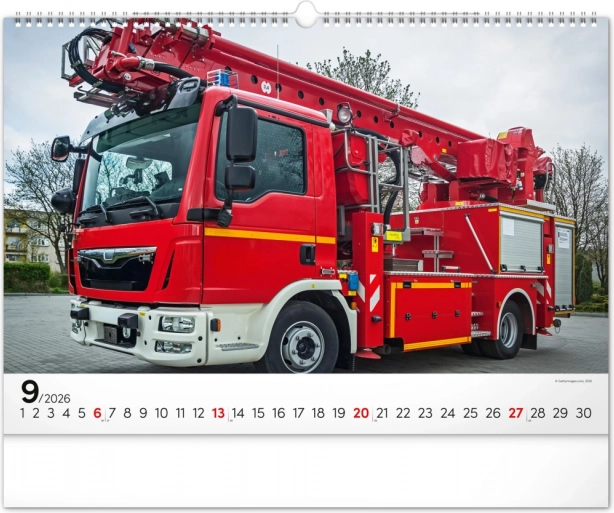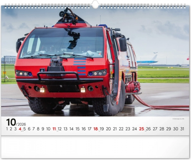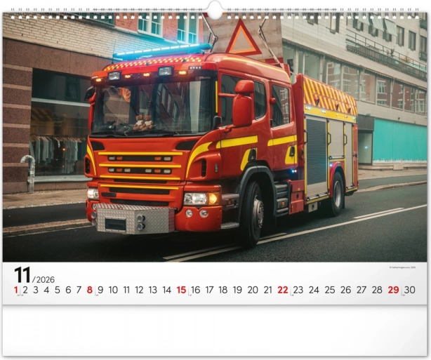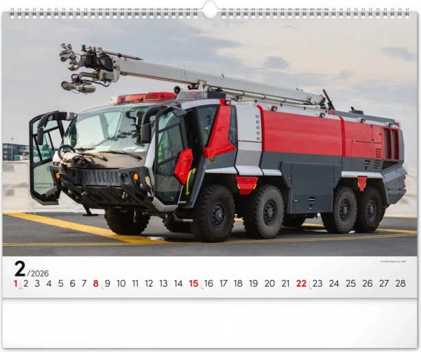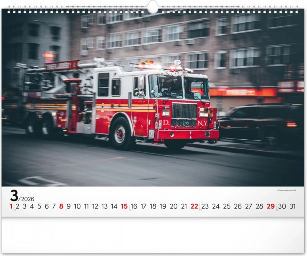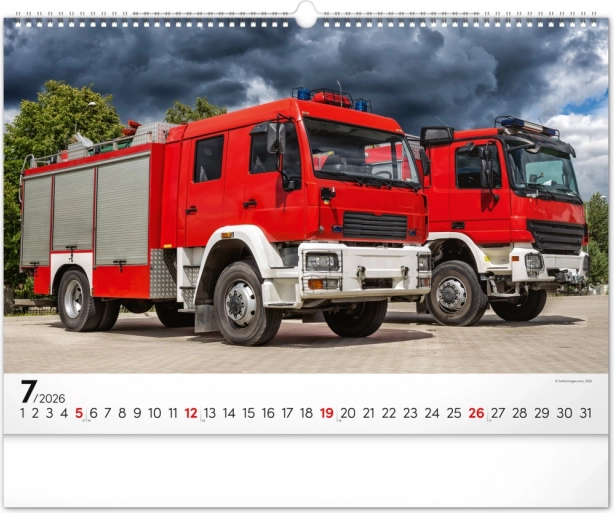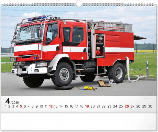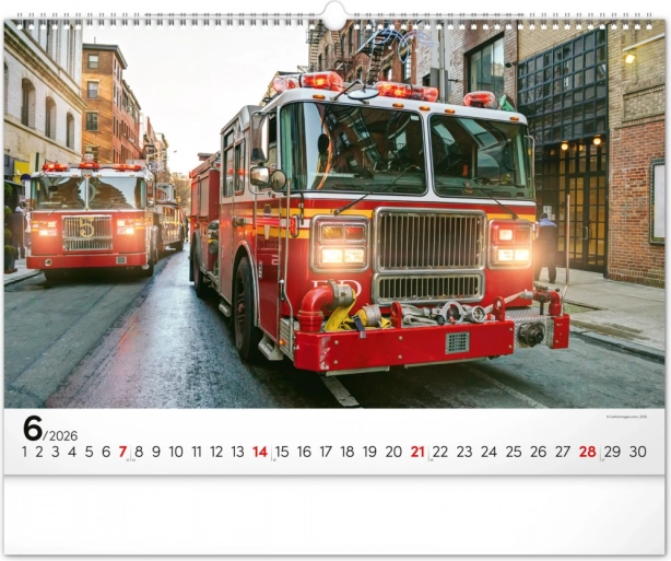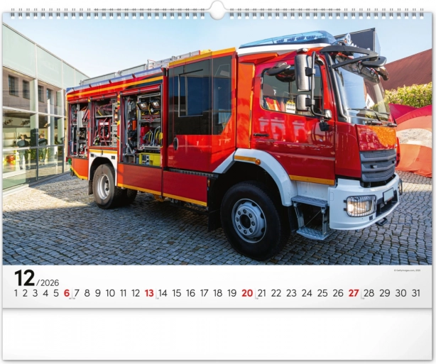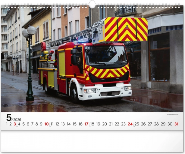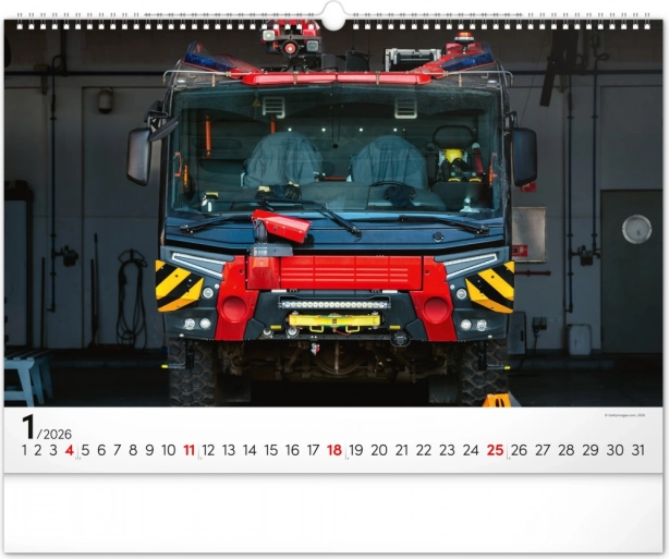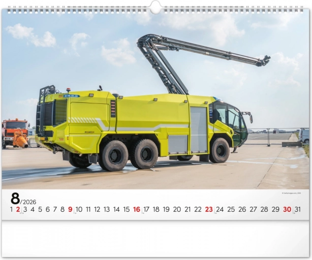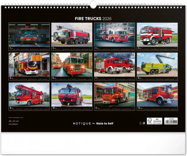 Chaque mois du calendrier présente des photographies uniques de camions de pompiers, qui séduisent par leur dynamisme et leur atmosphère flamboyante. Le calendrier dispose d’un calendrier universel, clairement agencé sur un élégant fond noir.