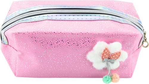 Cette trousse pour maquillage ou fournitures scolaires est réalisée dans une teinte rose élégante et décorée de délicates paillettes. Sur l’avant, une adorable application en forme de nuage duveteux avec un petit nœud est agrémentée de deux perles décoratives, conférant à l’ensemble un charme unique.