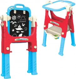 La hauteur et l’angle du tableau sont réglables pour s’adapter à la taille et à l’âge de l’enfant. Le set comprend tout le matériel nécessaire : 12 crayons, 12 craies de couleur, 4 feutres à base d’eau, 10 feuilles au format A4 et une éponge, ainsi qu’un organiseur pour les accessoires. La base stable et la chaise solide assurent le confort lors des activités créatives, renforçant les capacités manuelles et la perception spatiale.