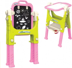 Le tableau est doté d’une hauteur et d’un angle d’inclinaison réglables, ce qui permet de l’adapter à l’âge et à la taille de l’enfant. Le set comprend les accessoires de base complets : 12 crayons de couleur, 12 craies de couleur, 4 feutres à base d’eau, 10 feuilles A4, une éponge et un organiseur pour les accessoires. L’enfant peut créer confortablement grâce à la base stable et à la chaise robuste, développer sa motricité fine et sa perception de l’espace.